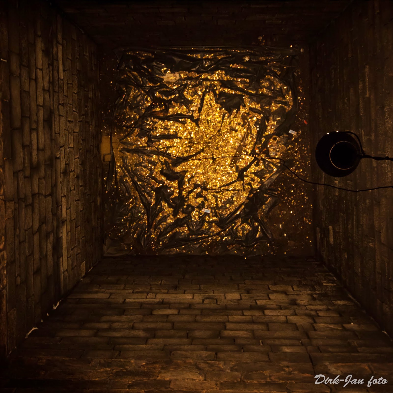 Een panorama bij de sluis van Edam, met de zon die achter de bomen aan het verdwijnen is.